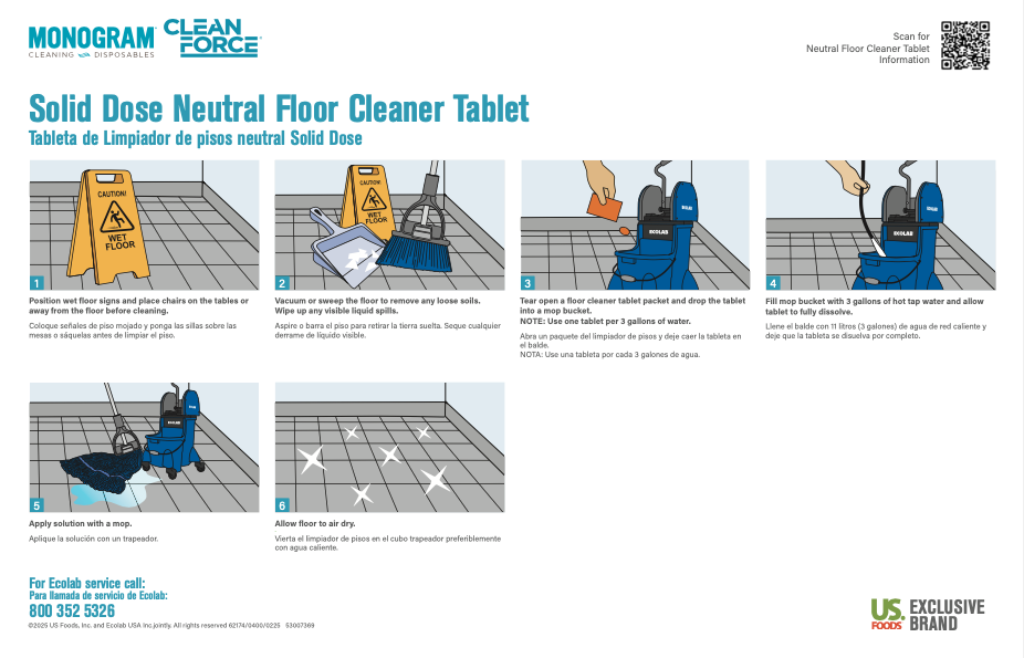 Step-by-step instructions on how to clean with Monogram Clean Force Solid Dose Neutral Floor Cleaner