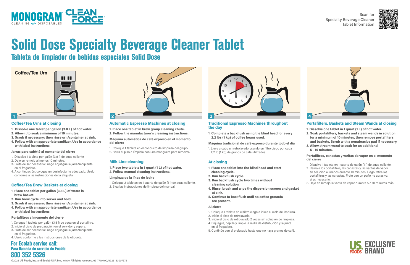 Step-by-step instructions on how to clean with Monogram Clean Force Solid Dose Specialty Beverage Cleaner